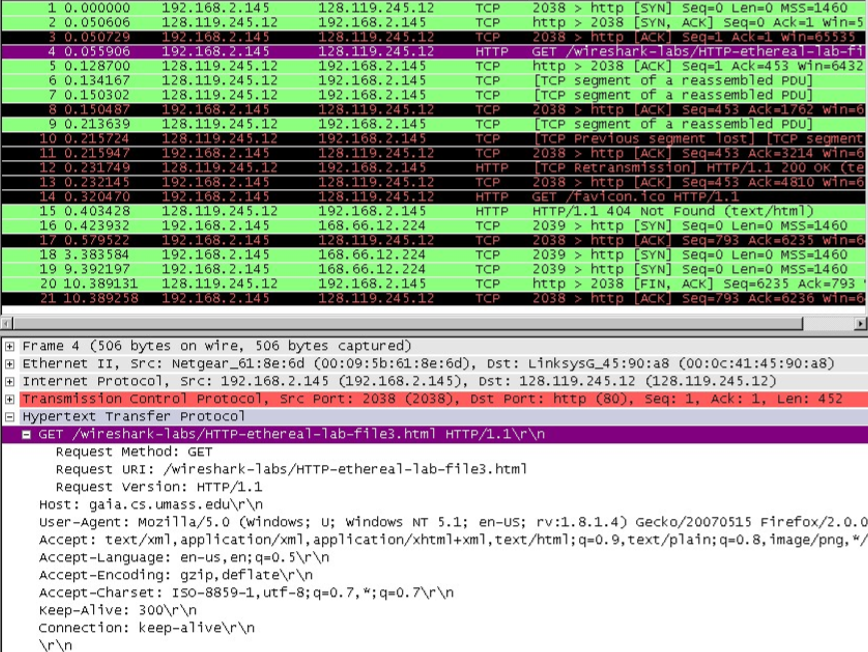 在任务三的基础上,清除你的 ARP 缓存,接下来,确保浏览器的缓存是空的。打开URL:http://gaia.cs.umass.edu/wireshark-labs/HTTP-ethereal-lab-file3.html。同样设置不显示 IP 和更高层协议,您现在 Wireshark 窗口应该如下所示: