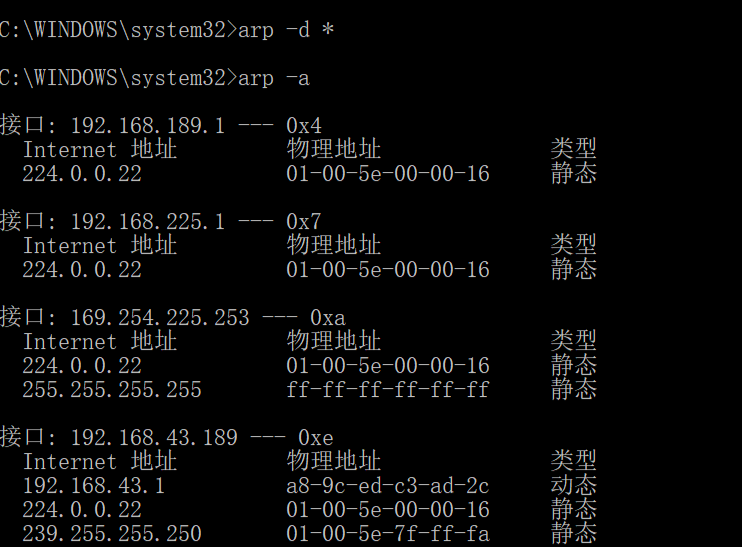 为了观察您的计算机发送和接收 ARP 消息,我们需要清除 ARP 缓存,否则您的计算机很可能在其缓存中找到所需的 IP-Ethernet 地址转换关系,因此不会发送 ARP 消息。执行删除命令后,再查看缓存内容,如下图所示。