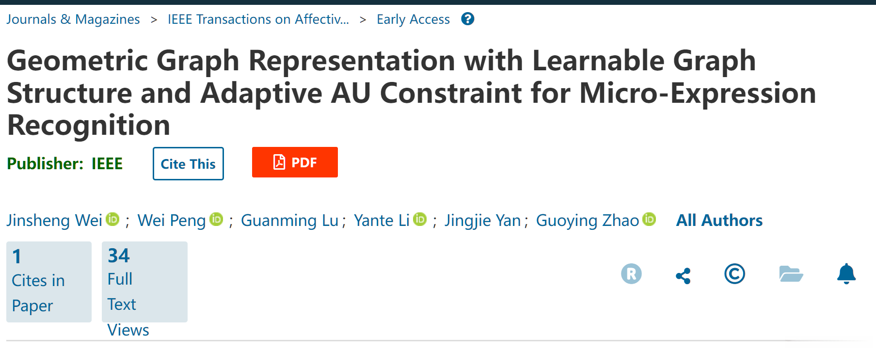 IEEE Transactions on Affective Computing上的一篇文章,做微表情识别,阅读完做个笔记。不愧是Fellow在Trans上的文章,做得很扎实。本文用面部特征点为主,AU为约束,利用起始帧、峰值帧和结束帧三帧数据,采用GNN做了微表情识别。提出了几个子模型用于提取特征,设计了新的损失函数,邻接矩阵也是能学习调整的。