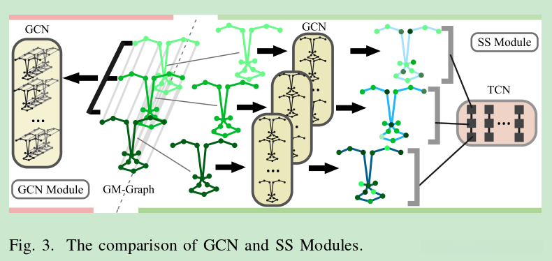 SSmodule adopts GCN to aggregate the spatial information forthree frames,respectively.Then,TCN is adopted to aggregatethe temporal information between three frames.