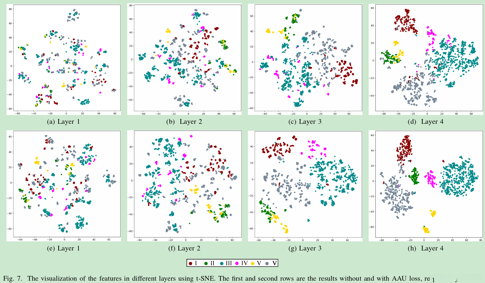comparingwith not using AAU loss,the extracted features have someregularities on the first two layers after using AAU loss.