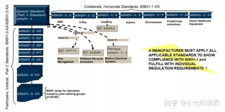 医用电气设备的标准主要是按照IEC 60601的标准定义,如图所示标准包含三个部分,第一是通用标准(General Standard),通常以IEC 60601-1来表示。在IEC的第三版里,通标里面主要还引用规整了几个板块的内容,比如第12章节的ISO14971风险管理部分,第14章节的IEC62304以及第16章节医用电气系统的IEC62366部分。横向的是并行标准(Collaterals, Horizontal Standard),接下来会讲三个重要的部分,一是60601-1-2电子兼容性(EMC)部分;二是60601-1-6可用性(Usability)部分,这个部分其实是60601-1以及IEC62366两个定义的结合;三是60601-1-11家用健康安全环境下使用类(Home Healthcare Equipment),我们平时在家里常用的血糖仪、血压计、体温计,这些都是家庭环境下会使用到的医用设备,都需要考虑到60601-1-11这个标准。最后是纵向的特标/专标(Particular Standard),它跟通标及并行标准最大的区别在所有的医用设备都需要考虑后两者,而特标是针对特定的医用设备。比如说60601-2-10部分,它是一个电炙机器的专用要求,只有涉及到神经肌肉刺激器这种产品我们才需要去考虑这个标准,再比如60601-2-25是心电图(ECG)的部分,80601-2-30是无创血压计的部分。在纵向标准这里,我们可以在图上看到有的是IEC60601,还有的是ISO80601标准,它们其实都是属于在60601这个系列标准下的架构,60开头的标准一般是国际电工版IEC牵头写的标准,而80开头的则是国际标准委员会ISO牵头制定的标准。