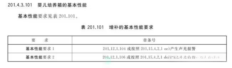 从操作层面来看,在产品具备专门标准的情况下,则应当遵循标准规定的'基本性能'定义条款。如果该条款确实进行了明确的规定,则可以直接引用标准中所设定的基本性能参数作为依据进行应用。例如针对婴儿培养箱类设备而言,在新版标准201.4.3中就对'基本性能'这一部分做出了详细规定,并且对于此类设备类型的标准参数值也已经给出了明确的数值范围限定(见图示)。其中具体的参数包括"皮肤温度超限报警"和"空气温度超限报警"两个方面。由于温度超限这一现象,在产品设计层面还应当设置一层附加的'报警功能'作为第二道防护机制,在发生异常时能够及时发出警报提示以供医护人员采取相应措施。然而如果在实际应用过程中该报警功能未能得到保障,则会导致医护人员无法及时识别到设备运行中的异常状态从而产生误判的可能性最终造成不可接受的风险后果因此规范性地将'报警功能'列为基本性能指标是更为合理的做法