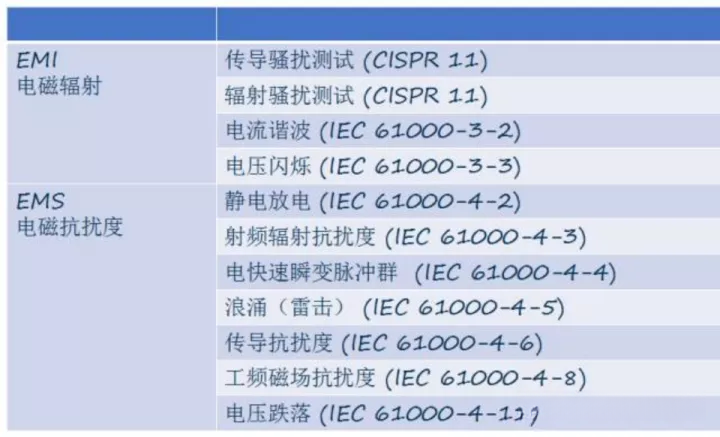 只要做过电气类设备的都不会对电磁兼容陌生,我国现行使用的是YY 0505-2012(idt IEC60601-1-2:2004)版本,YY 0505-2012的替代版本YY 9706.102-2021版已经颁布,2023年5月23日实施,等同于IEC60601-1:2015以及IEC60601-1:2005+A1:2012(修订3.1版)。而现行国际标准是IEC60601-1-2:2014+A1:2020(4.1版),这个版本里很多的要求变得更为严格,从安规以及电磁兼容的标准都可见我国采用的标准要比国际的慢一些。电磁兼容包括两部分,第一个是电磁辐射(EMI),你的设备是否会影响到其他的设备,比如使用话筒的时候,手机来电就会产生杂音干扰到话筒的使用;第二个是电磁抗扰度(EMS),指的是别的设备对你的设备进行干扰时抵抗干扰的能力。EMI及EMS所包含的测试请参考下图,在EMS的测试里面经典放电及射频辐射抗扰度在4.1版本里变得相当严格。更改包括:EMC作为风险分析的一个组成部分(对基本安全和基本性能特征的影响),使用风险分析作为建立测试级别的原因。抗扰度测试水平取决于使用环境:1)专业医疗保健(诊所,诊所等);2)家庭保健(家庭,企业,公共道路和建筑物,车辆);3) 特殊(核磁共振成像、军事、重工业)