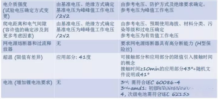本图列举了国标与国际标准的具体对比项,在测试指标方面存在显著差异。现将各项测试指标的差异一并告知各位,请关注新增的具体测试要求。