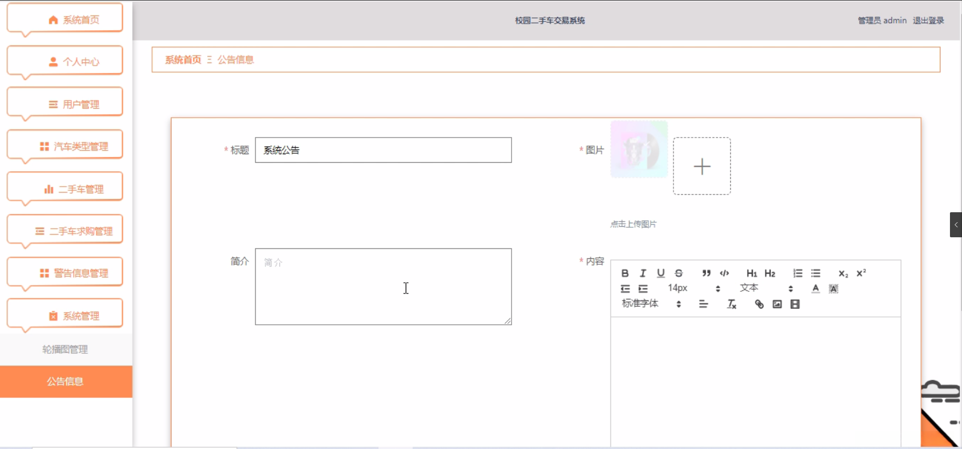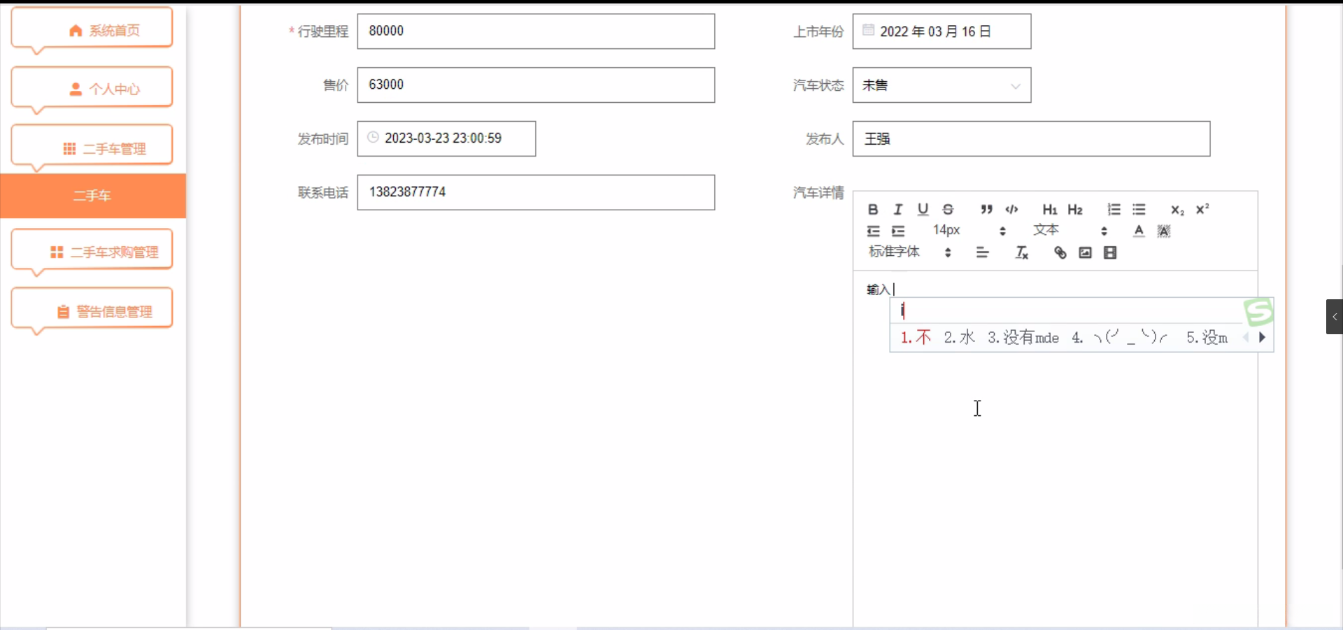 研究意义: 本项目旨在构建校园二手车交易系统,并通过其研发与完善过程实现多个目标。不仅能够建立一个集中且便捷的操作平台供学生进行二手车交易活动,在推进校园内二手商品规范化管理的同时也能提升整体运营效率。这一系统的构建不仅有助于规范校园内的二手商品交易流程并提高其效率,在深入研究与开发该系统的背景下还能够促进数据分析技术和人工智能技术等相关领域的研究与应用