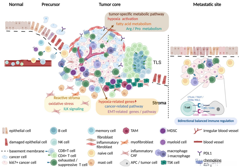 研究人员使用空间组学来放大癌症,揭示 TIME的各种特征。对正常组织和癌变组织的基因组、转录组、蛋白质组和代谢组的研究揭示了不同区域中细胞组成的差异、肿瘤免疫细胞相互作用组和肿瘤进展的相关性。