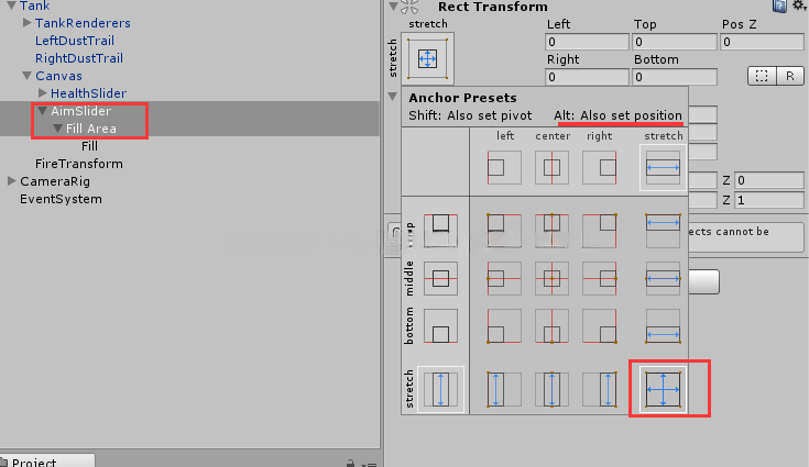 选择AimSlider并配置其子对象中的FIll Area选项(不选择Fill选项),通过按住Alt键全选所有设置,并指定区域为右下方。