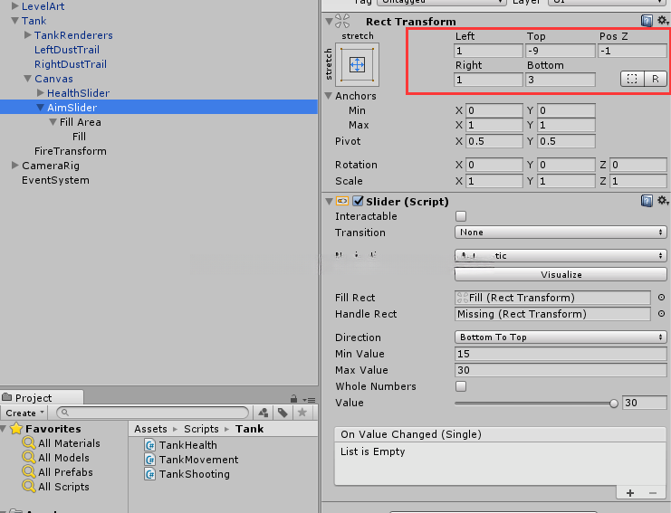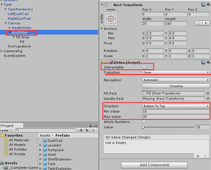 首先,在指定位置设置炮弹发射点,并在 Tank 区域内新建一个空对象命名为 FireTransform。该对象的位置参数设置为 (0, 1.7, 1.35),旋转参数设定为 (350°, 0°, 0°)。接着,在 Canvas 区域内新增一个滑动条并命名为 AimSlider,并删除其背景及句柄区域。选定 AimSlider 后取消交互模式勾选项,并将过渡效果设置为无(Transition: None),选择从底端到顶端的滑动方向(Direction: Bottom To Top),并将最小值设定为 15、最大值设定为 30。