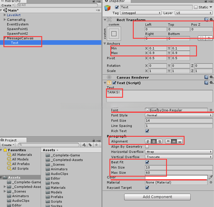 在UI编辑器中新建一个Text组件(或选择Text工具),系统会自动创建一个新的Canvas(每个Hierarchy只能包含一个唯一的Canvas,默认情况下该对象是Tank组件的子对象)。命名为MessageCanvas后,默认状态下左、右、上、下边界分别设为0,并设置Anchors Min值为(0.1, 0.1)、Anchors Max值为(0.9, 0.9)以限制显示区域。双击该Text组件后将内容修改为"TANKS!"并选中Best Fit适配模式(根据屏幕尺寸自动缩放),随后将最大尺寸设置为60像素并将背景颜色设置为白色以确保显示效果最佳。