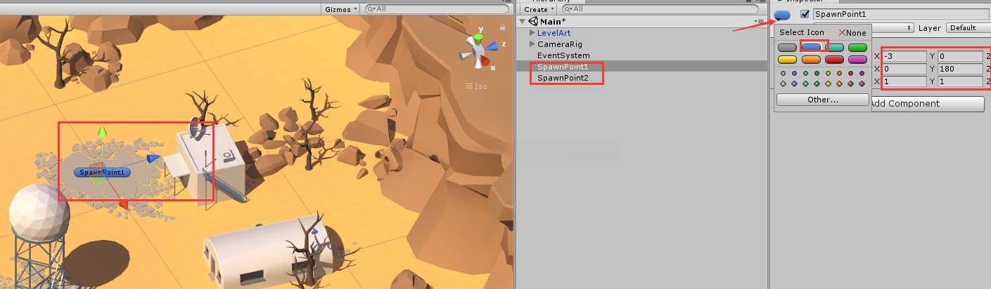 创建一个新的空对象,并将其命名为SpawnPoint1。设置其Position坐标为(-3,0,30),并指定Rotation参数值为(0,180,0)。同时设置其Label颜色选项为蓝色。另创建一个空对象,并将其命名为SpawnPoint2。设置其Position坐标值为(13,0,-5),并指定Rotation参数值组别为(0,0,0)。这两处位置将分别作为两辆坦克的起始点。