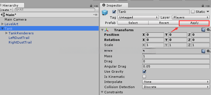 最后记得点击Apply使我们上面的设置与Prefabs下的Tank同步。