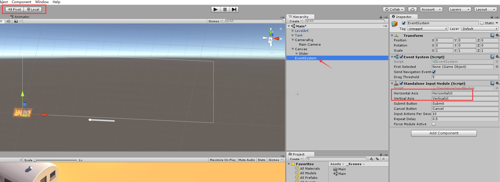 先将坐标模式设置为Pivot与Local。接着创建滑条(Hierarchy→Create→UI→Slider)。在之前的讨论中,在survival shooter中已经介绍过创建任何UI组件的方法:系统会自动生成Canvas和Eventsystem。双击EventSystem窗口后:将其更改为HorizontalUI;同样地:将其更改为VerticalUI。(这是因为玩家无需手动调整进度条:而Horizontal轴与Vertical轴则分别用于控制坦克的前后位置)