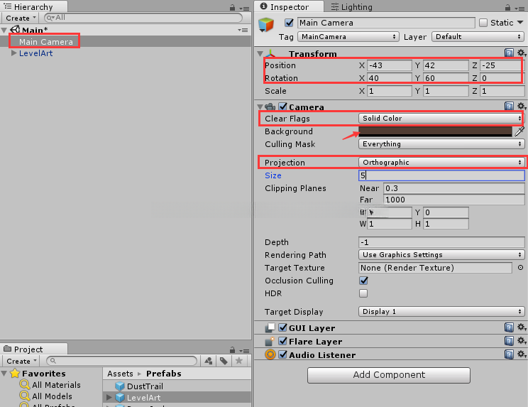 主相机的设置如下:首先单击位于Hierarchy菜单中的MainCamera选项。接着将Position字段设置为(-43.1.2.1),Rotation字段设定为(41°.61°.1°),并将Projection类型更改为正交投影(Orthographic)。此外,在Clear Flags属性中选择Solid Color选项即可实现屏幕上未绘制区域显示背景色的功能,并将其应用到Background颜色设定中,默认值设定为此处指定的颜色值组编号即可完成背景颜色的配置