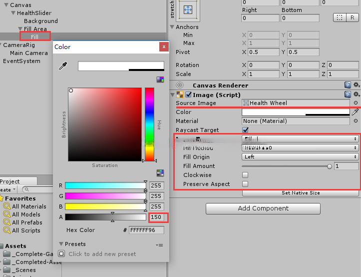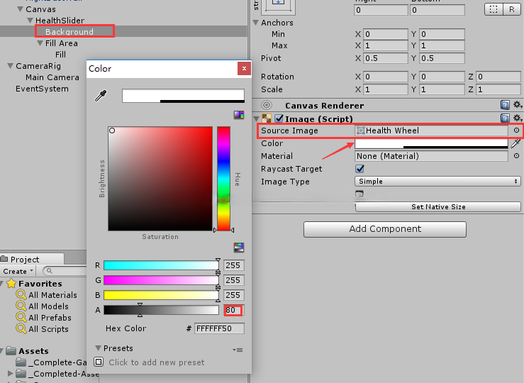将名为Slider的控件重命名为 Health Slider,并禁用 Input 字段。设置 Transition 属性为 None 以禁用滑条染色功能。将 Max Value 设置为 100 并将其置于右侧边缘位置。点击 Health Slider 的 Background 部分,在 Source Image 中选择 Health Wheel,并将 Alpha 通道设置为 80%。对于 Fill 部分,在 Source Image 中同样选择 Health Wheel,并将 Alpha 通道调整至 150%,同时设置 Image Type 为 Filled 并选择 Fill Origin 在左侧端点位置,并且禁用 Clockwise 检查框以避免逆时针填充模式的操作。