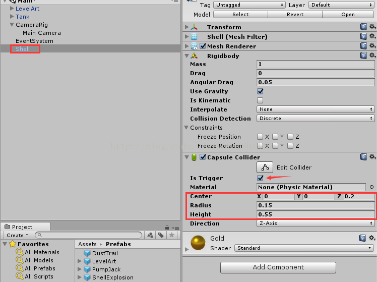 拖入位于Models文件夹中的Shell模型至Hierarchy中。随后,在该模型上附加一个Rigidbody组件(该组件赋予其重力属性以使炮弹自动下落)。接着新增一个CapsuleCollider组件到场景中,并勾选IsTrigger属性选项以便允许此类物体被坦克穿透。最后将CapsuleCollider的中心点置于坐标原点上方2个单位处,并将该物体的半径设定为0.15米;同时将其长度设置为0.55米以保证应有的形态特征。