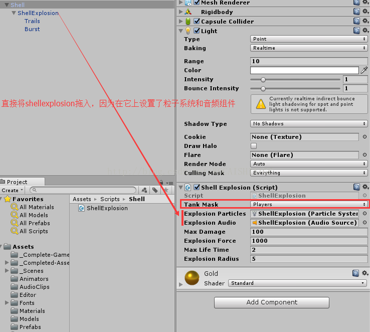 将位于Prefabs中的ShellExplosion拖入到当前工作区的Shell中,并将其设为子对象;随后,在子对象ShellExplosion中新增一个Audio Source组件;将AudioClip设为 ShellExplosion音频源;关闭 "自动播放" 和 "循环播放" 选项;接着在返回 Shell 之前,在其内部新增一个 Light 组件并配置使其模拟爆炸效果;最后将位于 Prefabs 中的 ShellExplosion脚本拖入到当前工作区的 Shell 并对其进行编辑设置