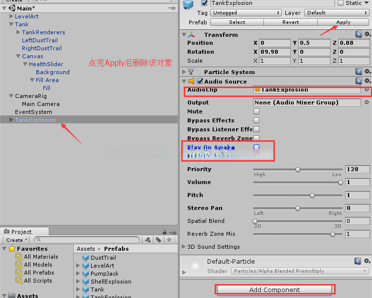 在Hierarchy面板中选择名为‘Tank’的对象,在继续点击Apply按钮以将更改应用到Prefabs中。然后点击Hierarchy面板中的对象并拖拽至右侧的Tree视图(注意不要拖拽 tank 对象)。接着,在 Tree 视图中找到位于 Prefabs层级中的 TankExplosion 拖拽至Hierarchy面板中(注意不要拖拽 tank 对象)。在 TankExplosion 中添加音频源,并将其类型设置为 TankExplosion 音频类型;请勿勾选‘立即播放’和‘无限循环’选项;最后点击 Apply 按钮以保存更改并完成操作后,请删除 Hierarchy 面板中的 TankExplosion 对象