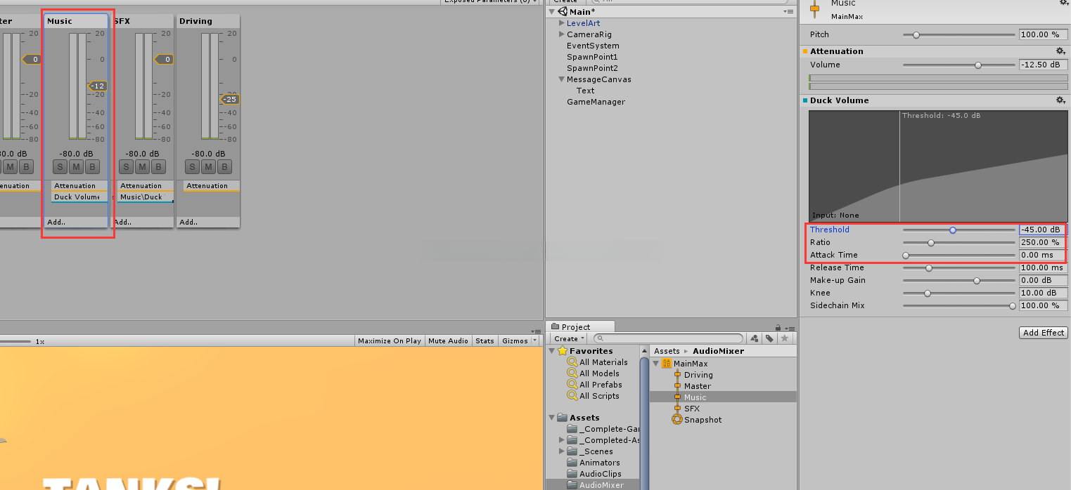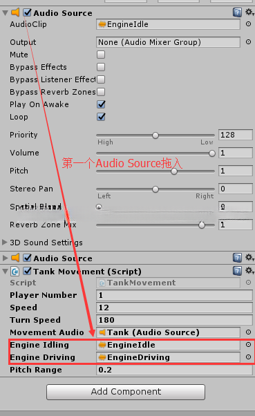 最后,在这一环节再添加一个新的Audio Source组件用于后续坦克发射的声音播放功能。