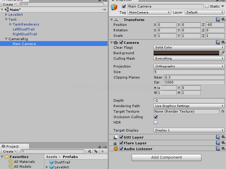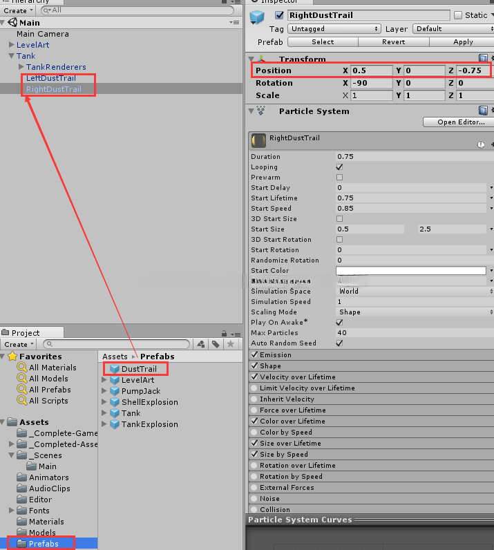 导入已配置好的tank至Prefabs文件夹中作为预制件以便批量使用。在Prefabs文件夹中查找DustTrail预制件(一种呈现扬起灰尘轨迹粒子效果的效果)。将该预制件拖接到Tank子对象下,并将其复制至 Tank子对象下。其中一个命名为 Left DUST TRIAL ,并设定其位置参数为 (-0.5, 0, 0.75);另一个命名为 Right DUST TRIAL ,并设定其位置参数为 (0.5, 0, -0.75)。