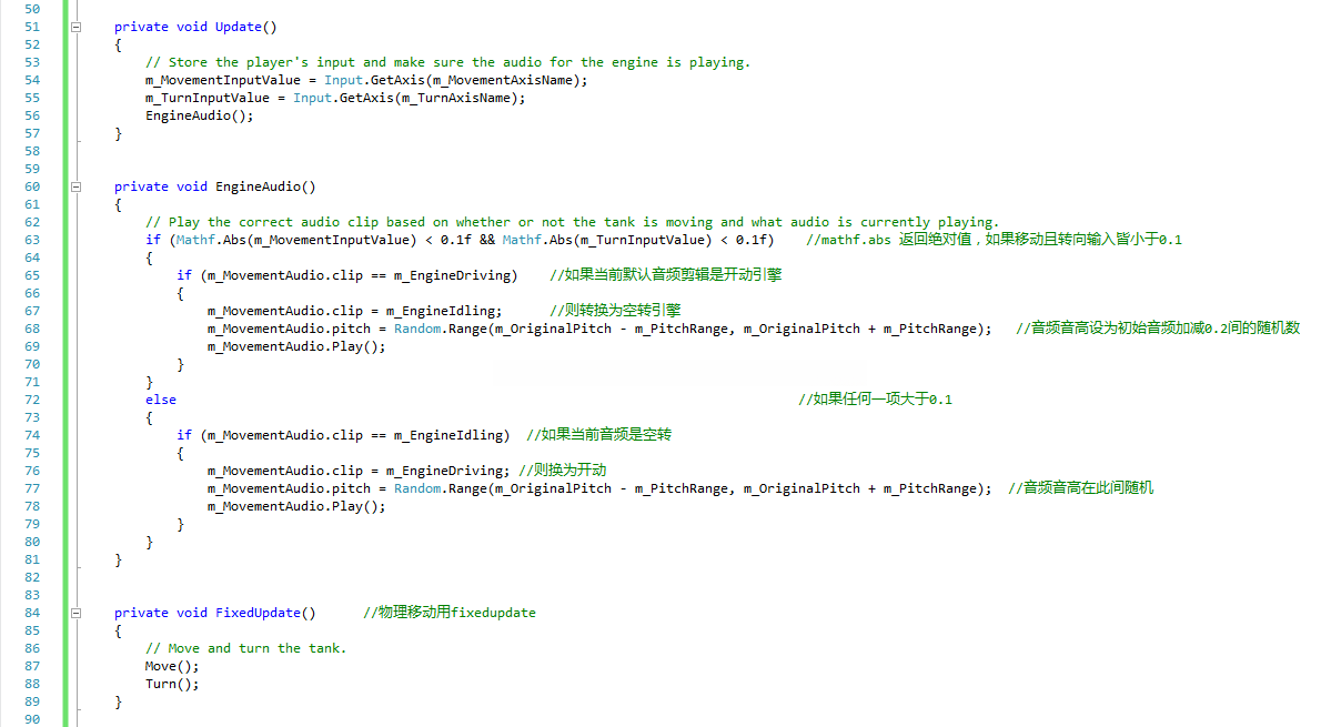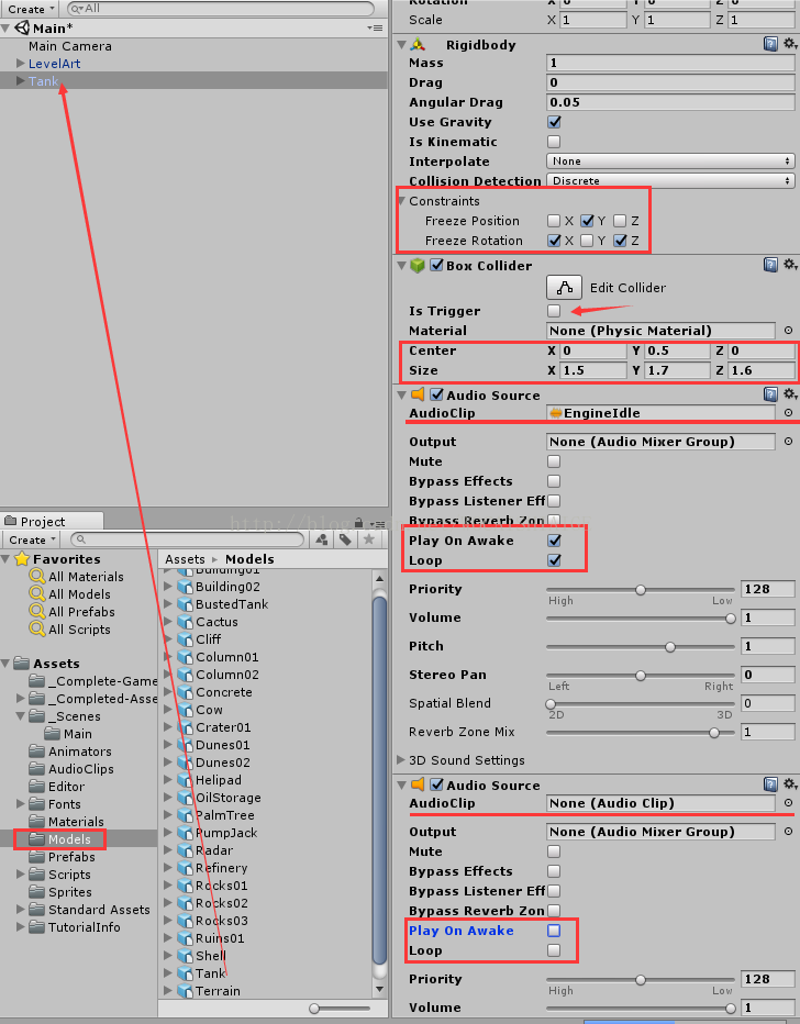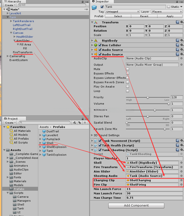 在保存后返回Unity时,请将引用TankShooting的所有内容导入;同时需确保AudioSource设置为第二个选项;其中第一个参数用于控制引擎声音切换。