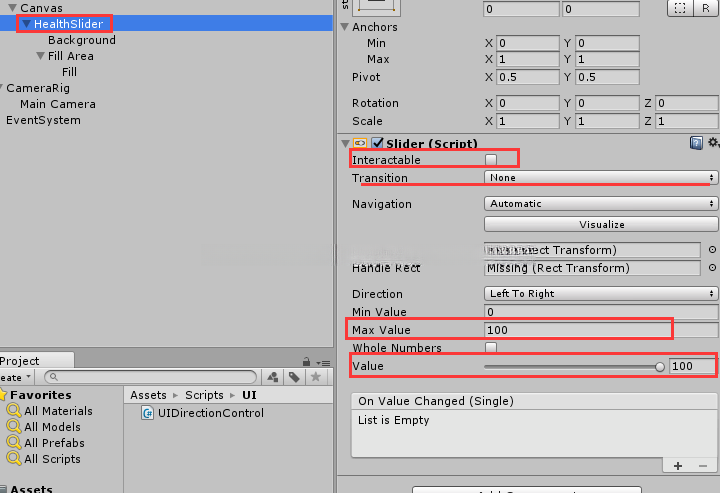 在Scripts文件/ folder中的Files/folder中导入UIDirection script到HealthSlider组件中。此操作是为了固定滑动条(slider)的角度以避免其随 HealthSlider组件转动而产生视觉疲劳。(healthslider的父对象是canvas)