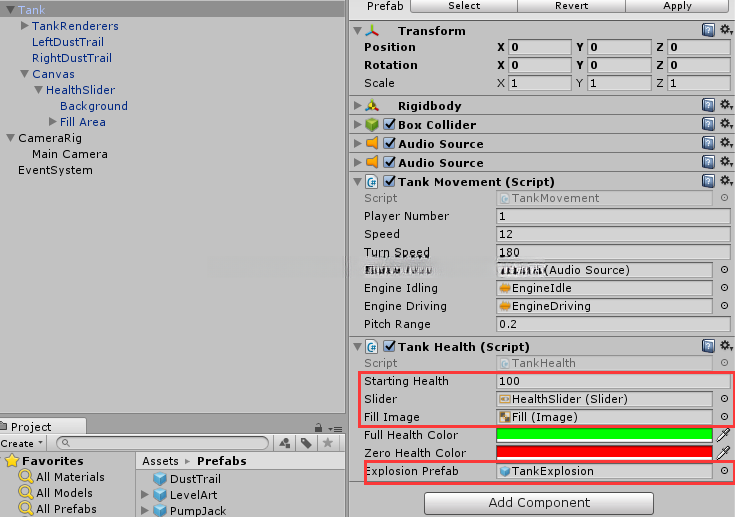 切换至Unity引擎后,请将所有与TankHealth相关的引用添加进去,并请确保点击 Tank 的 Apply 按钮以完成同步修改。
