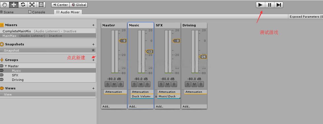 在Master界面中创建三个子对象用于音频分组,在创建好的三个子对象中分别命名为Music、SFX和Driving(若无法为这些子对象命名,请先启动游戏并播放相应音效后立即停止测试——这属于Unity的一个已知问题)。
