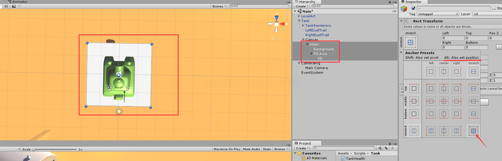 单击滑块并移除handle区域(无需安装按钮);按住Shift键并再次单击Fill以选中滑块及其子对象;选择Anchors预设项后按住Alt键以覆盖所有相关对象。