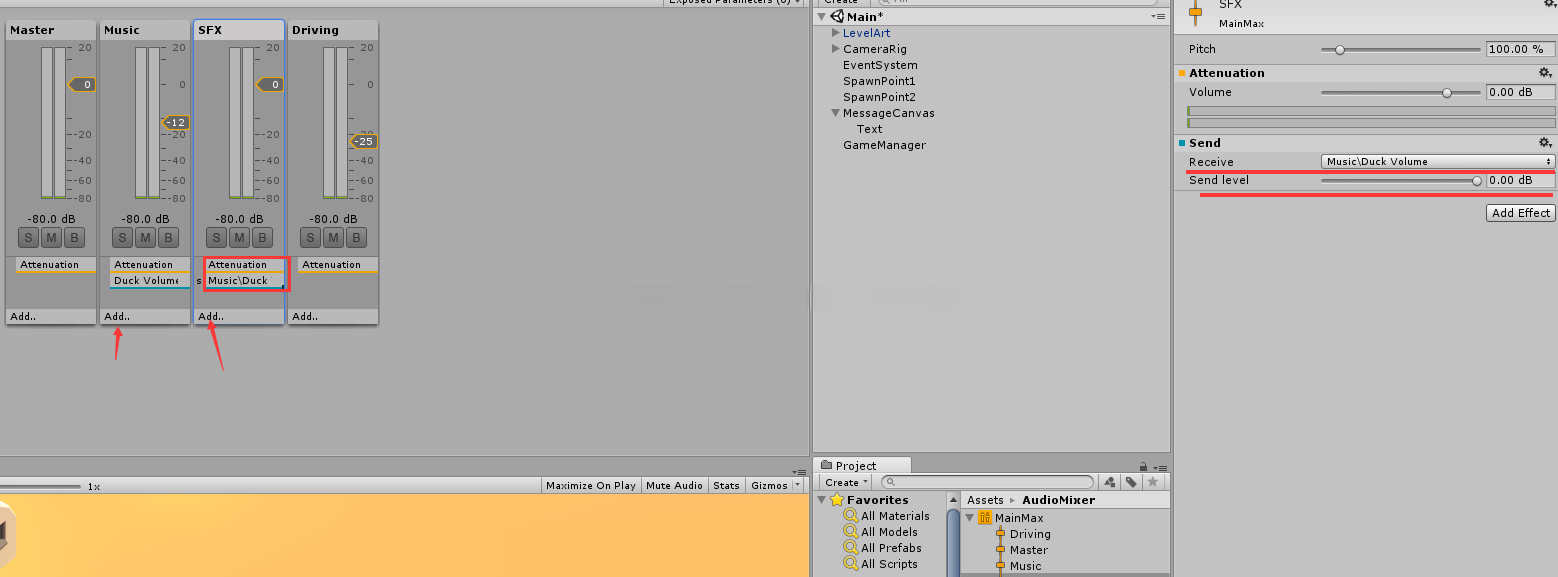 然后,在音乐轨道上启用回音效果(Duck Volume),接着在Effect Strip(效果条)上启用发送器效果(Send)。在Effect Strip上将接收设置为Music\d Duck Volume,并将Send level调整为0DB(这表示仅播放触发音乐所配置的一系列回音效果,并不会影响原始SFX内容)。