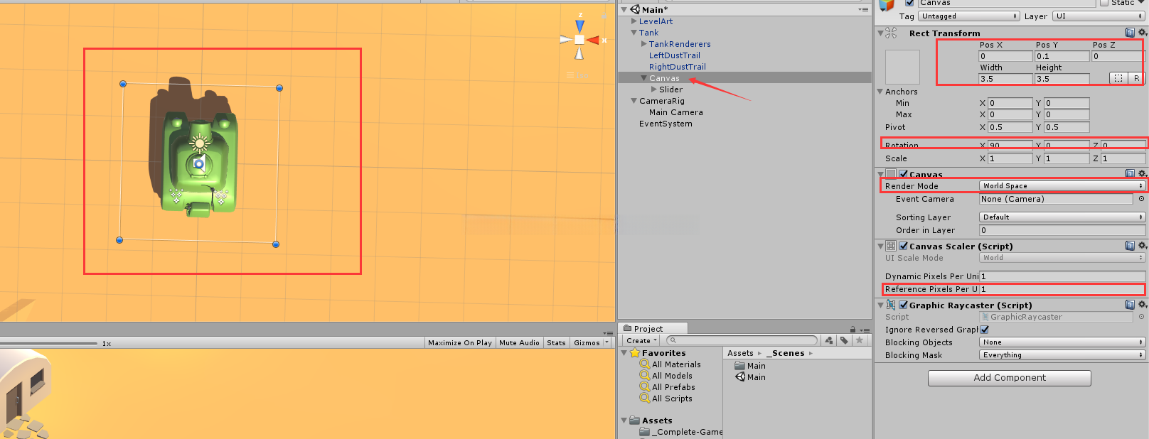 再次点击Canvas并切换至World space模式,在Overlay选项中设置为'Screen'模式以调整场景尺寸和分辨率,在此过程中相应的画布也会随之自动调整。随后,在Scaling Factor设置中将数值修改为1以确保每个渲染单位对应的实际像素数为1个像素。接着将当前的画布拖入 Tank 容器中作为其子对象,并通过拖动 Tank 容器来同步调整画布的位置。在完成以上设置后,请您依次执行以下操作:一是将画布的位置参数设定为(0, 0.1, 0);二是调整缩放比例以及旋转角度分别设为90度,并选择沿X轴方向进行旋转;最后双击进行焦点对焦操作即可观察到当前的Draw Mode能够完美地围绕在 Tank 容器周围。
