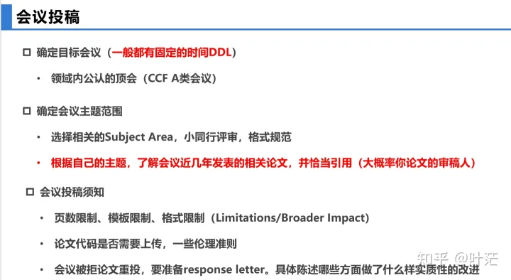 会议投稿流程:通常由3至以上专家评审小组进行评估。根据专家意见进行回复,以回应评审意见。最后由领域主席(AC)综合考虑后决定论文是否录用。