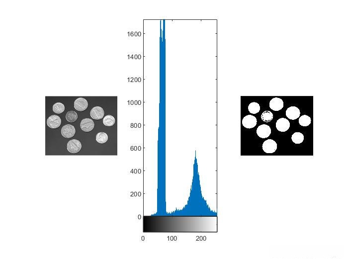 3、打开 Matlab内容自带的coins.png图像,显示并观察它的直方图,选定一个阈值对其进行分割