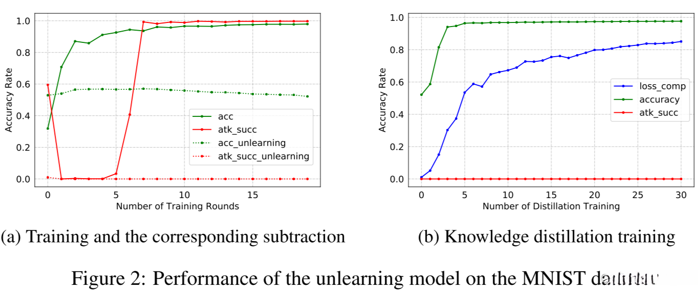 我们提出的方法能够彻底消除由已识别攻击者引入的后门行为,并且其带来的模型性能损失控制在合理范围内。该方法通过去除攻击者的参数更新历史并借助知识蒸馏技术恢复训练目标网络。具体而言,在实验中我们采用旧的全局模型作为教师网络来训练新的去向网络。该方案具有以下优势:1)能够有效防止被注入的恶意指令;2)保持了较高的分类准确率;3)避免了传统防御机制可能带来的性能瓶颈;4)无需额外的数据集增强需求。