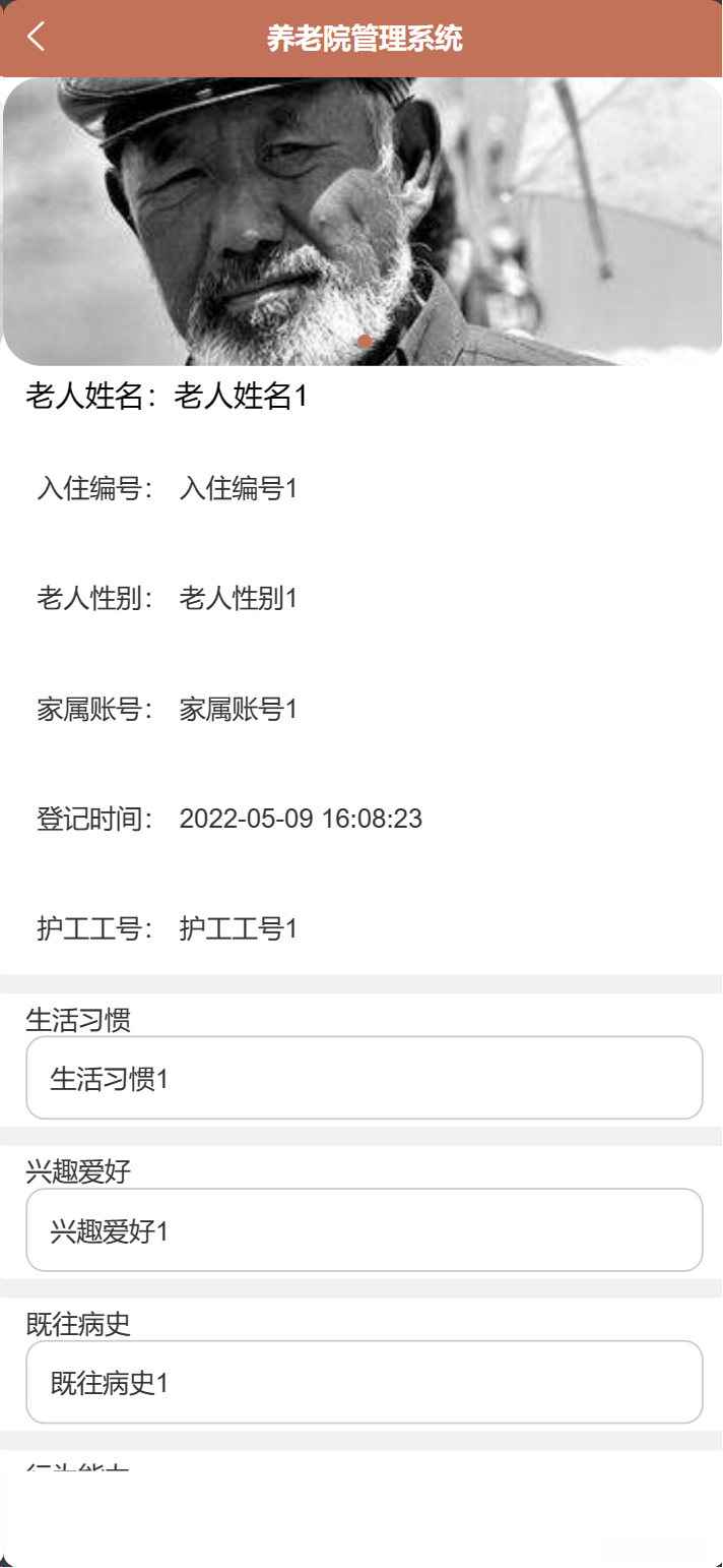 | 5 | laorenzhaopian | varchar | 老人照片 | 是 |