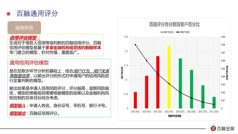 这是我们的6个客群评分,这个评分实际上对金融机构来讲非常重要,因为大家希望我们把坏人全过滤掉,好人全放进来,这是不可能实现的。现实中我们的评分通常居于两者之间,我们的目标是尽可能的靠近最好的那个部分。除了这7个标准评分之外我们还有定制产品,刚才邵峰介绍的给客户做定制化的建模,因为好的客户希望结合他的内部数据和我们百融数据一起构建一个专属于他的评分,这样效果会比标准评分更好。