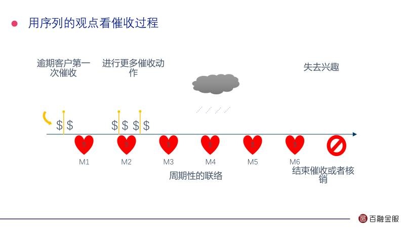在你借了金融机构的钱之后,如果你一旦逾期不还钱,这个时候金融机构在内部是按照你逾期的时间给你划分的,M1代表逾期一个月,M2是两个月,在不同的逾期时间,它会给你不同的催收动作。