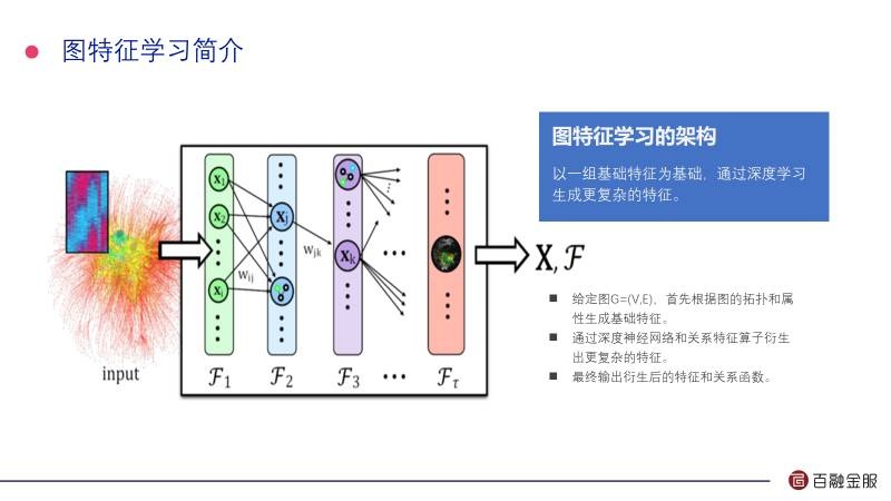 这是图特征学习算法大概的框架。因为我们输入的是我们客户图的特征,这张图包括边和点,图的拓谱和节点的这些属性构造了客户的基本特征。通过深度神经网络,从这些基本特征出发衍生出更复杂的特征。最终我们输出的是什么?一个是衍生后的特征,再一个是观察,观察为了从基础端衍生数学特征,把这个算法形成好东西移植到其他部分。