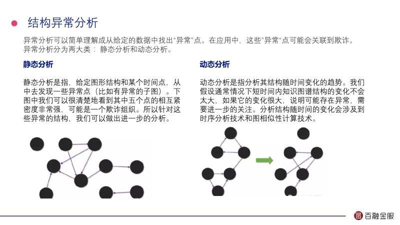 静态分析像我们第一个案例里面讲的结构。动态分析,通常情况下人的行为特征应该是稳定的,如果你短时间变化快的话,那我们认为你也有欺诈嫌疑。