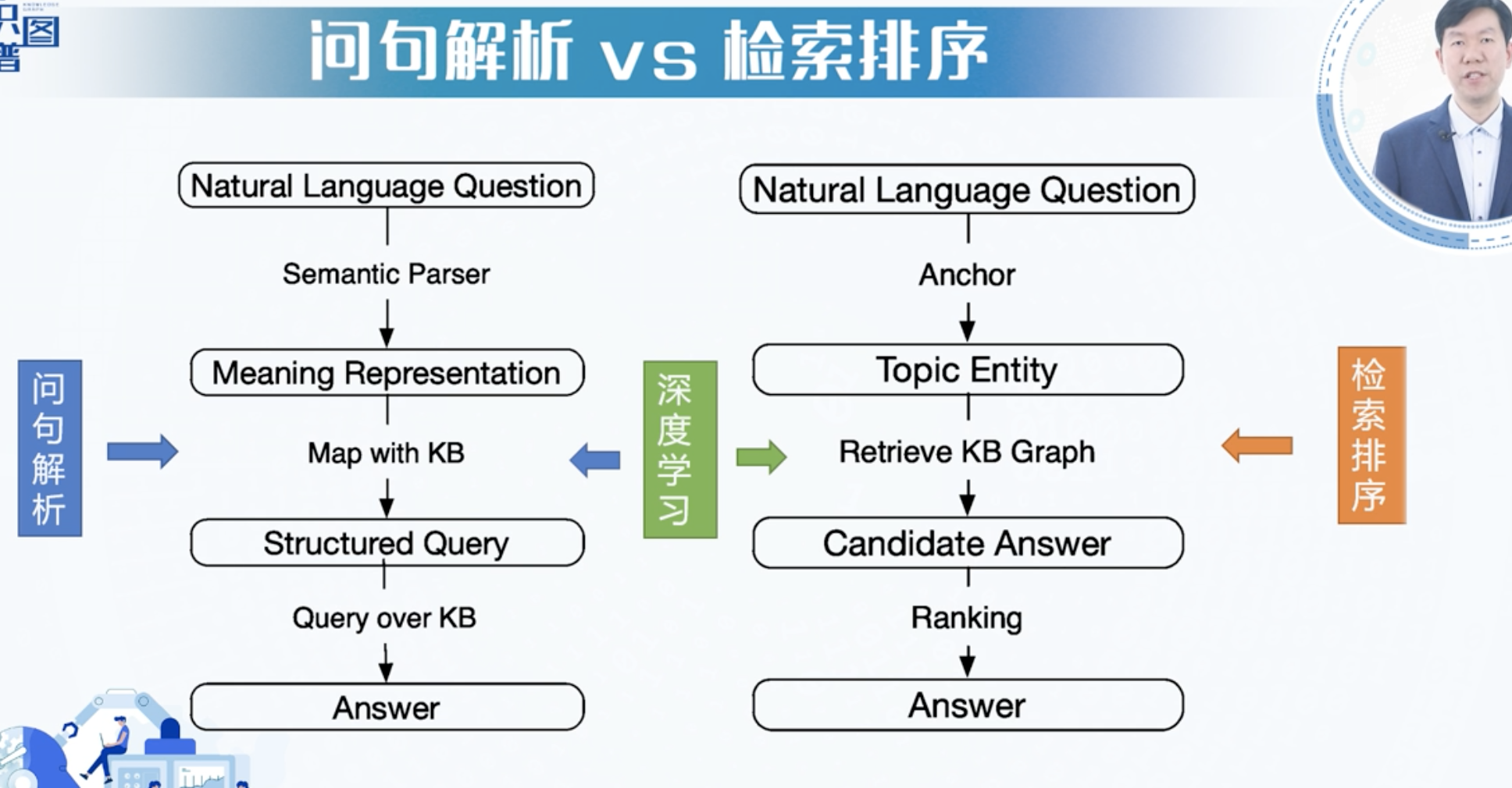Semantic Parsing 将自然语言转换为SPARQL/SQL。这是一种以语言学为基础的方法。它将自然语言转换为一系列形式化表示这些概念与关系的逻辑结构。通过对这些逻辑结构进行自底向上的分析。最终构建出能够完整表达问题语义的统一的形式化模型。利用相应的查询指令在知识库中检索相关信息。从而完成对问题的答案求解过程。