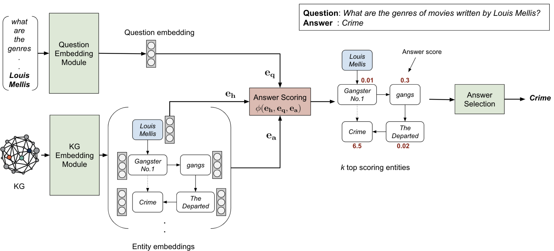 In evaluating performance, we construct a scoring function based on triplets composed of head entities, questions, and candidate entities within two hops of the head entity's subgraph within the knowledge graph.