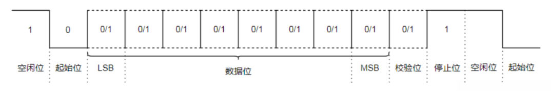 空闲时段中, 若无数据传输请求, 则应保持高电平状态.为了确保通信稳定性和准确性, 发送端与接收端必须严格同步其工作频率. 这一要求来源于避免累计误差的可能性. 因此, 不应连续发送超过一个字节的数据块.