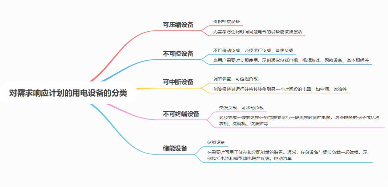 智能设备必须能够通过控制信号进行通信。为了有效运行,HEMS必须能够从设备接收一些基本信息。设备必须能够测量重要信息,如电流、电压、功率和温度,通过信号将这些数据发送给HEMS控制器,并接收来自HEMS的指令。因此,设备本身必须是智能的,或者需要使用智能插头将传统设备转换为智能设备。例如,智能冰箱可以将霜冻周期切换到非高峰时间,或者智能洗衣机可以将其运行周期推迟到非高峰时间。然而,大多数智能设备都能够由用户手动控制,以在需要时覆盖自动控制。例如,无论电价如何,如果用户需要打开空调,他们都可以这样做。智能设备之间的通信系统可以基于标准WiFi通信,这已经存在于室内。建筑物中常用的技术包括有线电力线通信(PLC)和各种技术,如采用IEEE 802.15.4标准的Zigbee、采用IEEE 802.11标准的WiFi、采用IEEE 802.15.4标准的WiFi、采用X10标准的X10以及采用IEEE 802.3标准的以太网。由于电器能源能源消耗方面具有不同的特点,因此很难为所有这些产品开发一个通用模型。因此,文献中的各种研究试图通过为所有设备创建一个有限的类别来简化HEMS的建模复杂性。通过使用这些类别,设备按照其一般行为分类到需求响应程序(DRP)。根据电器的特性对其进行分类,可以减少在HEMS中对其进行建模所需的信息。下图显示了设备及其特性和对DRP的响应。