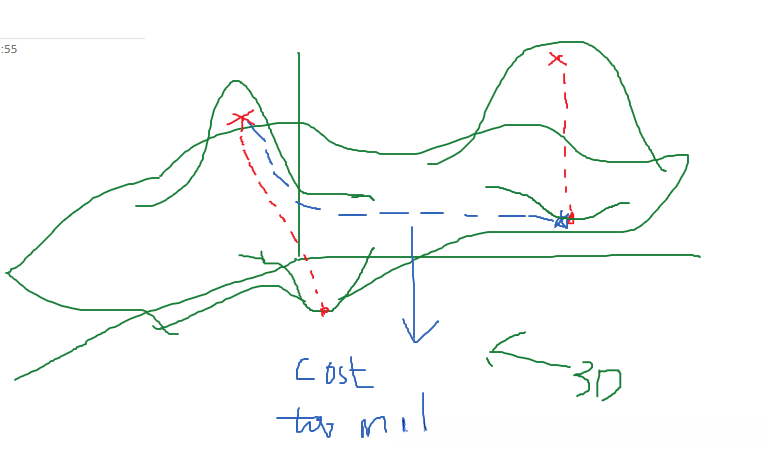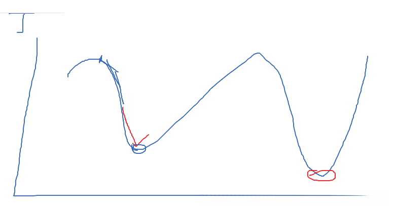 该算法类似于一个下山的过程。假设从左侧山顶出发,在红色方向向下滚动(此过程即为通过求导后从当前位置减去梯度与学习率的乘积—见公式)。在这里的学习率即代表每次迭代步长的大小;显然这样的成本更高)。同样地,在右侧山顶出发的话,则有可能抵达右侧的一个局部最优解;或者也可能抵达左侧另一个局部最优解(取决于行走的具体方向)。当然这些情况都需要较高的计算成本