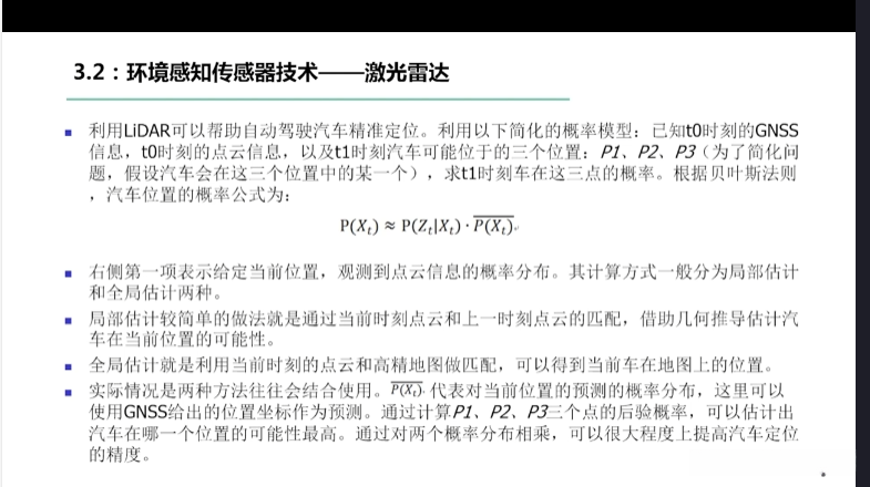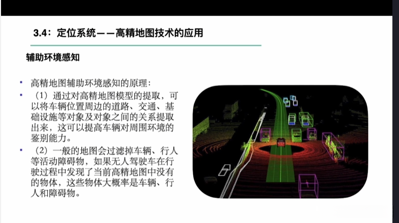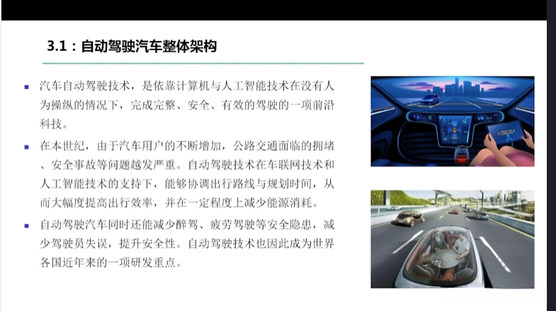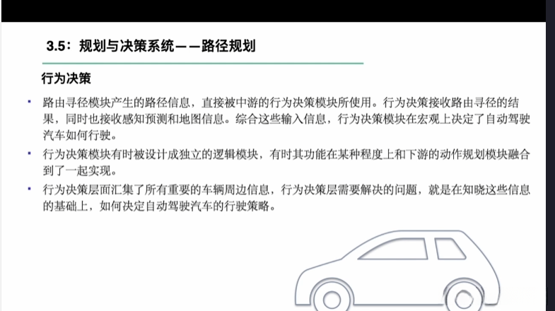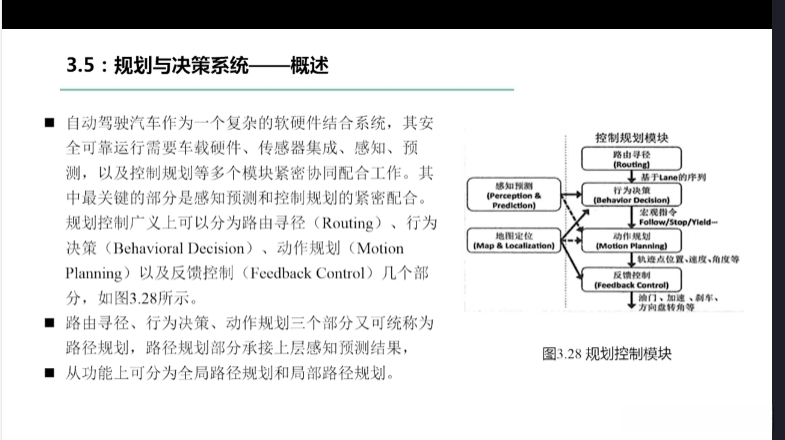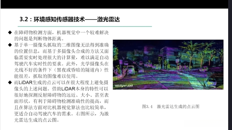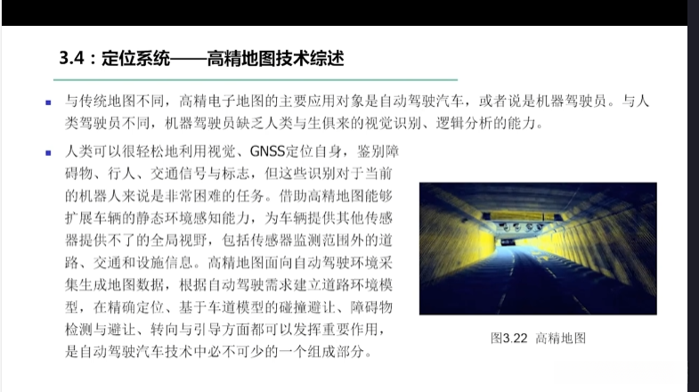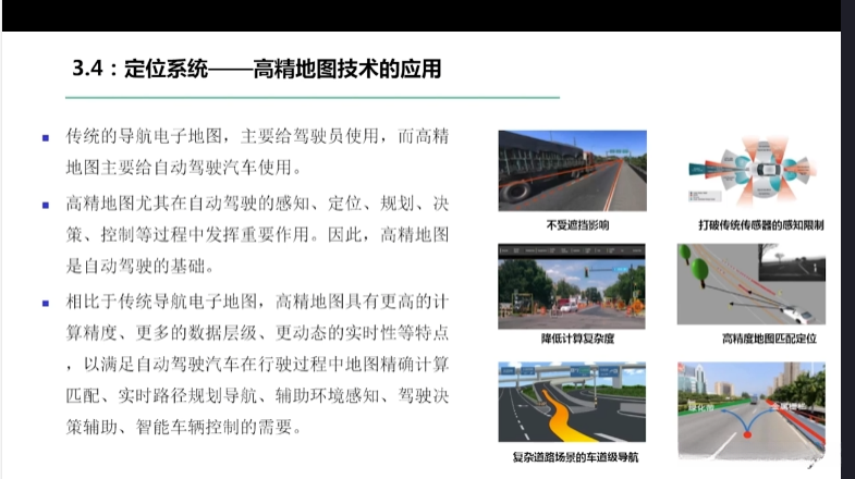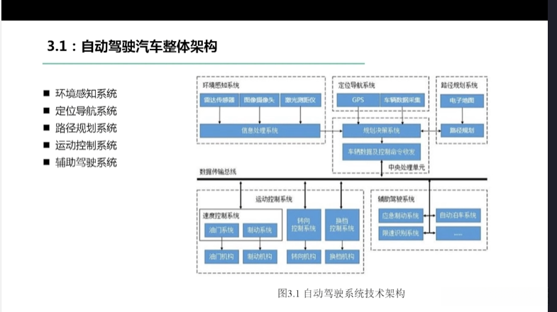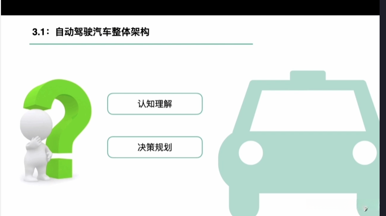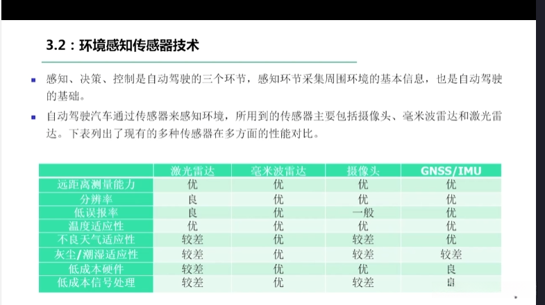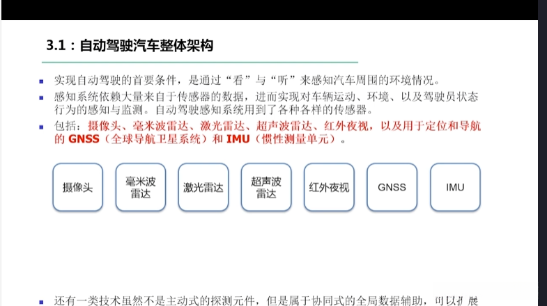第一章自动驾驶技术概论第三节自动驾驶汽车技术架构 3.1自动驾驶汽车整体架构 3.2环境感知传感器技术 3.3定位系统 3.4定位系统高精地图技术概述 3.5规划与决策系统概述 3.6V2X技术概述