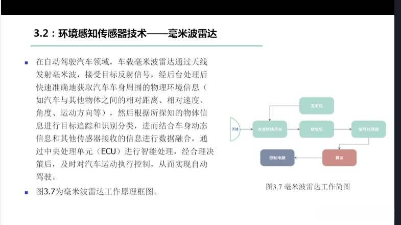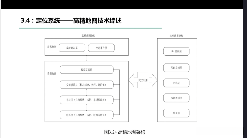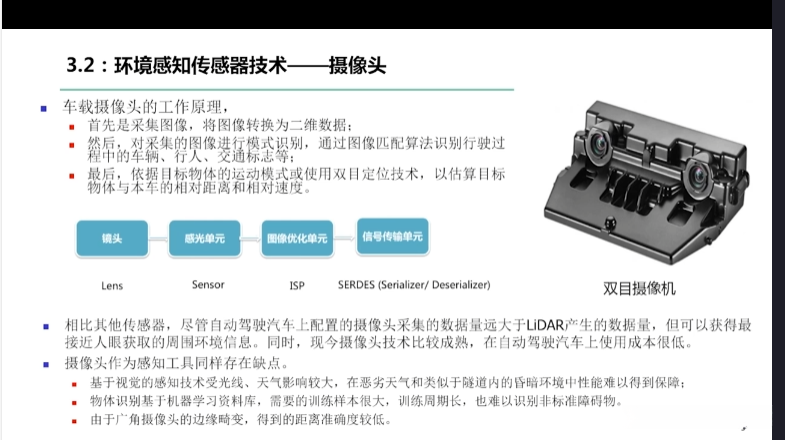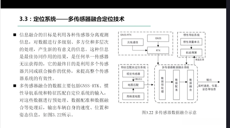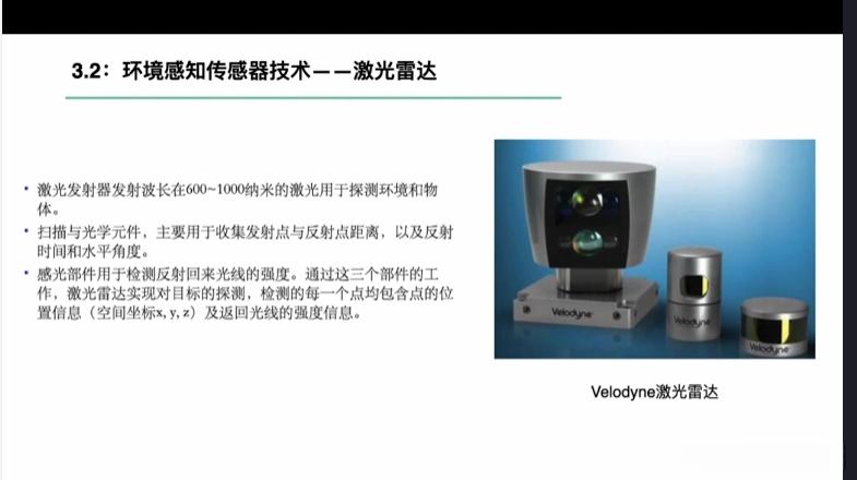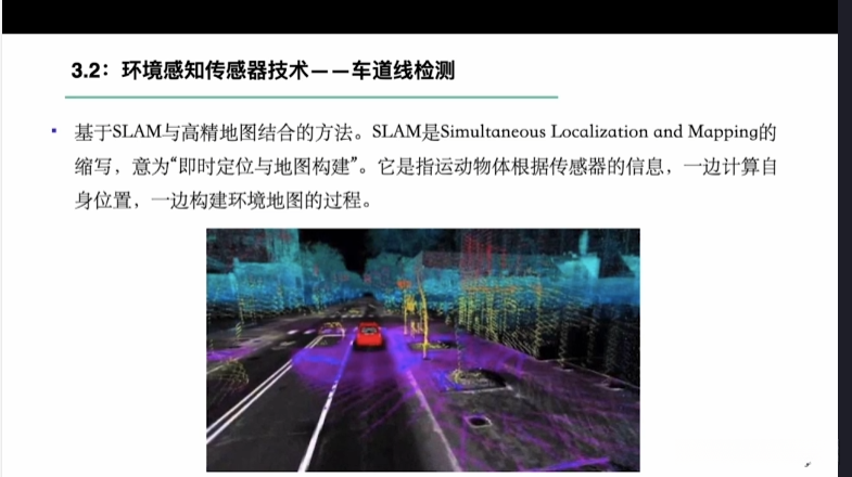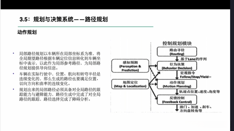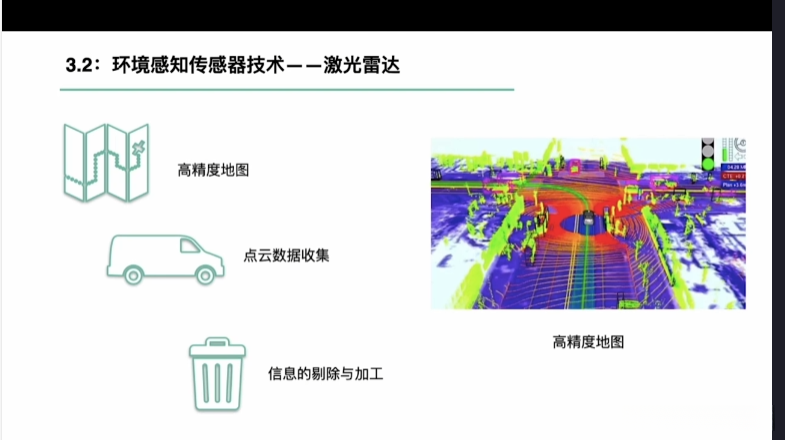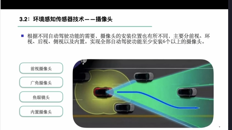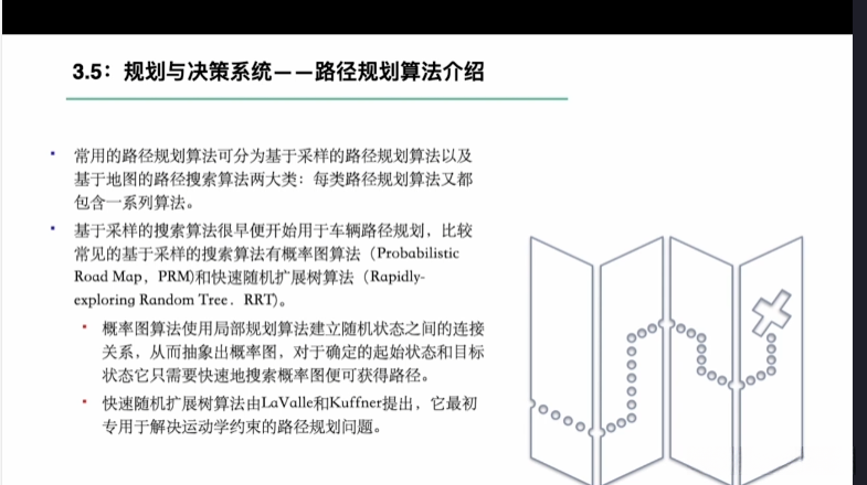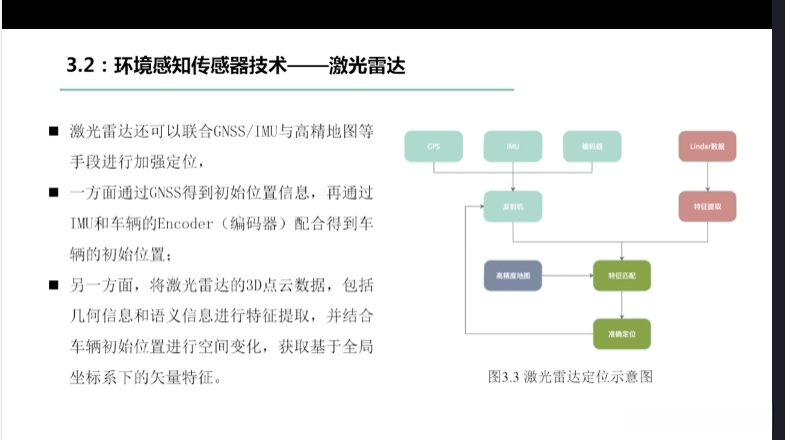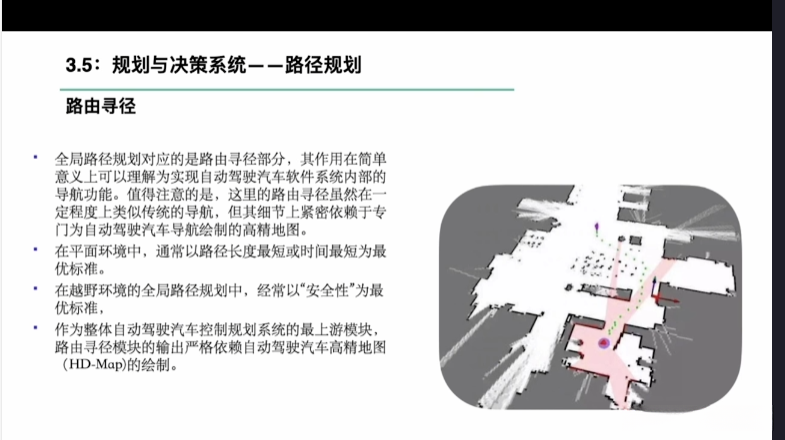 第一章自动驾驶技术概论第三节自动驾驶汽车技术架构 3.1自动驾驶汽车整体架构 3.2环境感知传感器技术 3.3定位系统 3.4定位系统高精地图技术概述 3.5规划与决策系统概述 3.6V2X技术概述