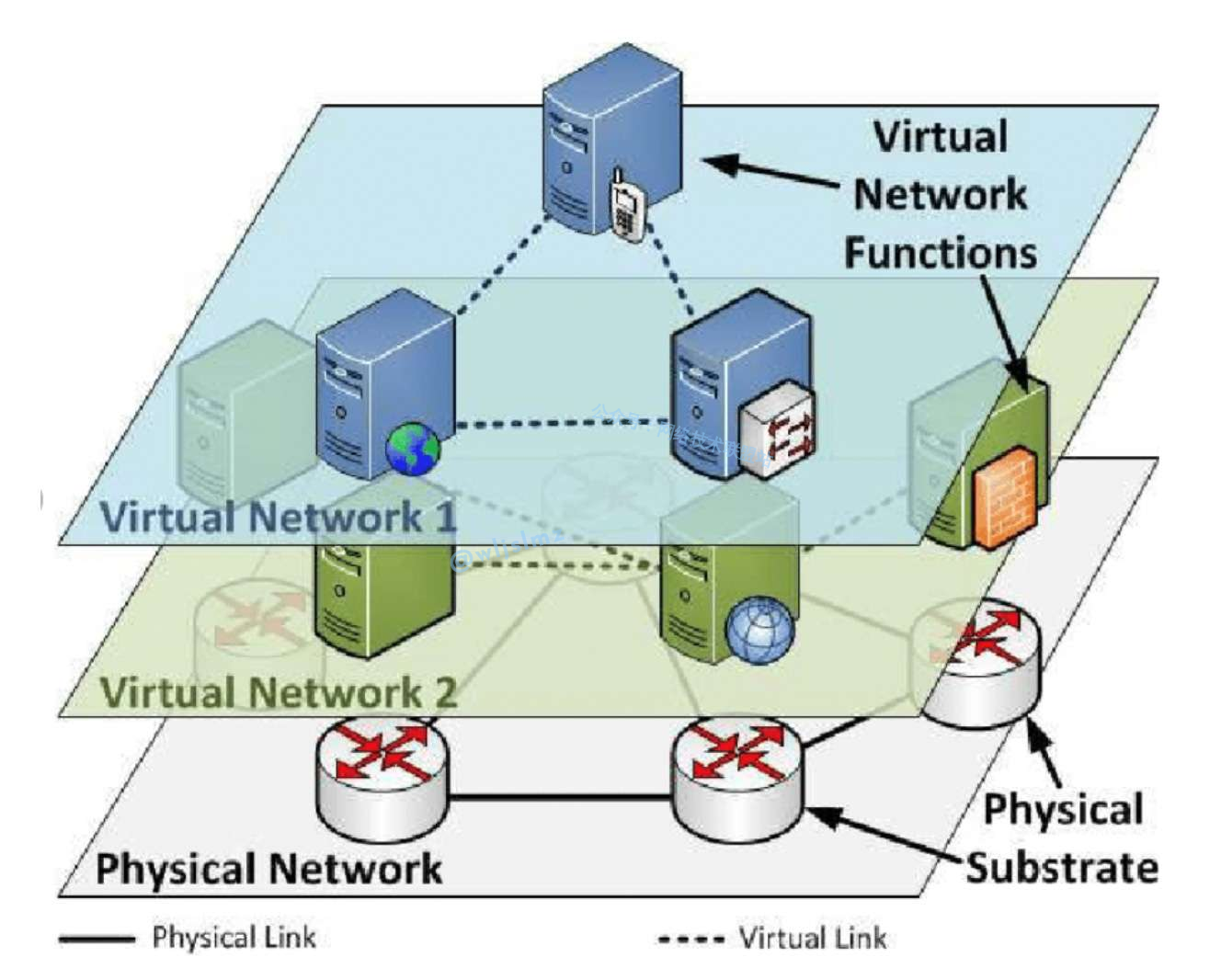 - NFV:通过软件的方式实现网络功能,在通用硬件上运行。