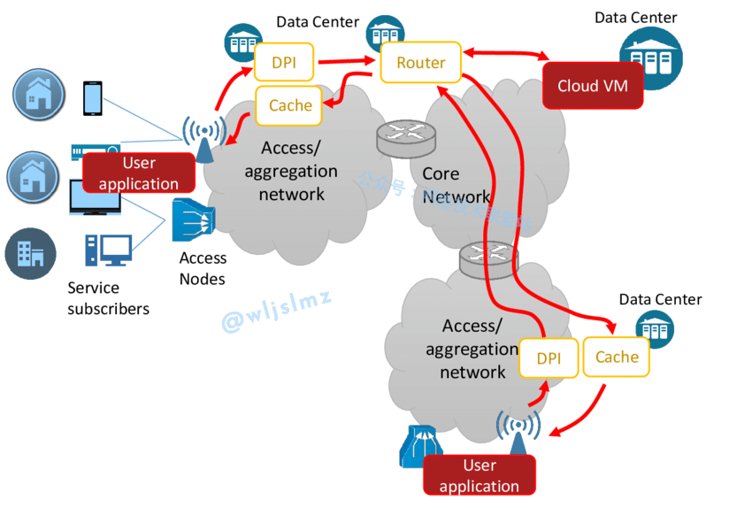 边缘计算 :边缘计算主要应用于分布式NFV和SDN领域。通过将VNFs部署于边缘设备上能够更加高效地响应并处理各种类型的边缘应用程序数据。