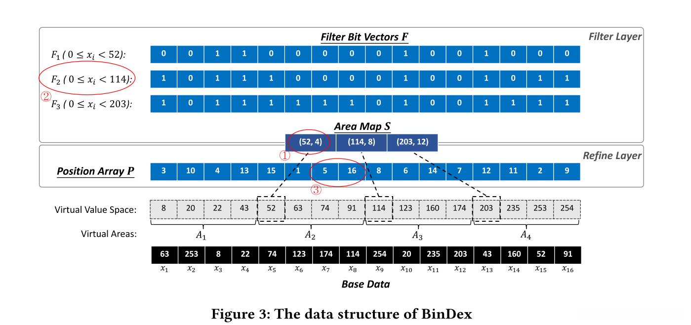 基于virtual value space,BinDex中主要有三种数据结构,即区域图、一组滤波位向量和位置数组。