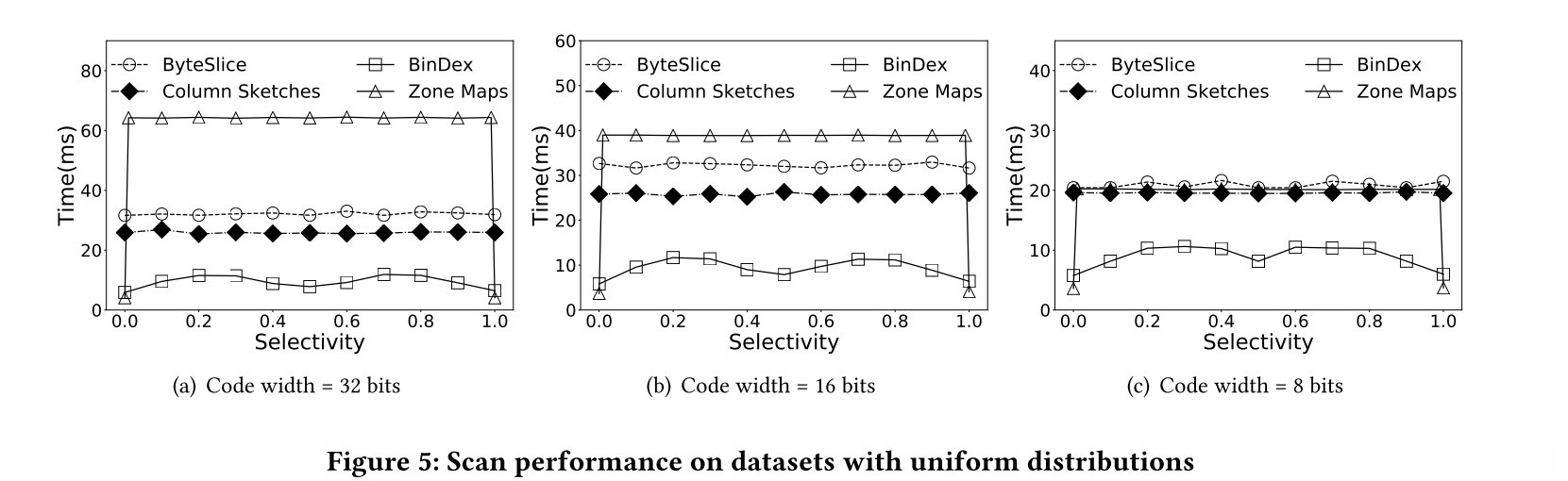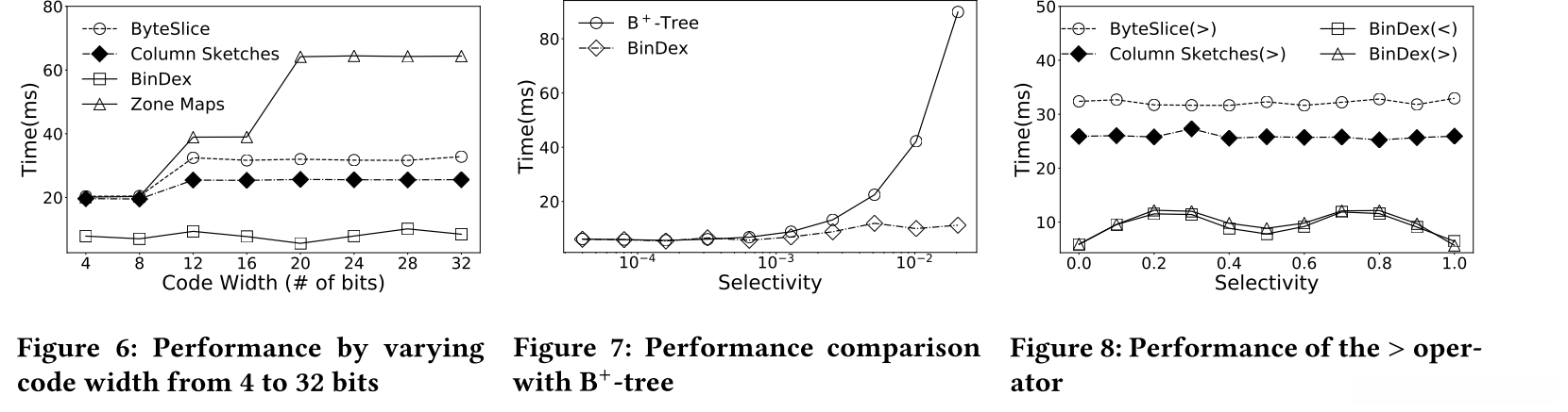 图5比较了BinDex与其他方法在不同代码宽度下的选择性。对于所有工作负载,BinDex明显优于所有竞争对手的方法。例如,对于32位代码宽度,BinDex的性能分别是Column sketch、Byteslice和Zone map的2.1倍、2.9倍和5.6倍。